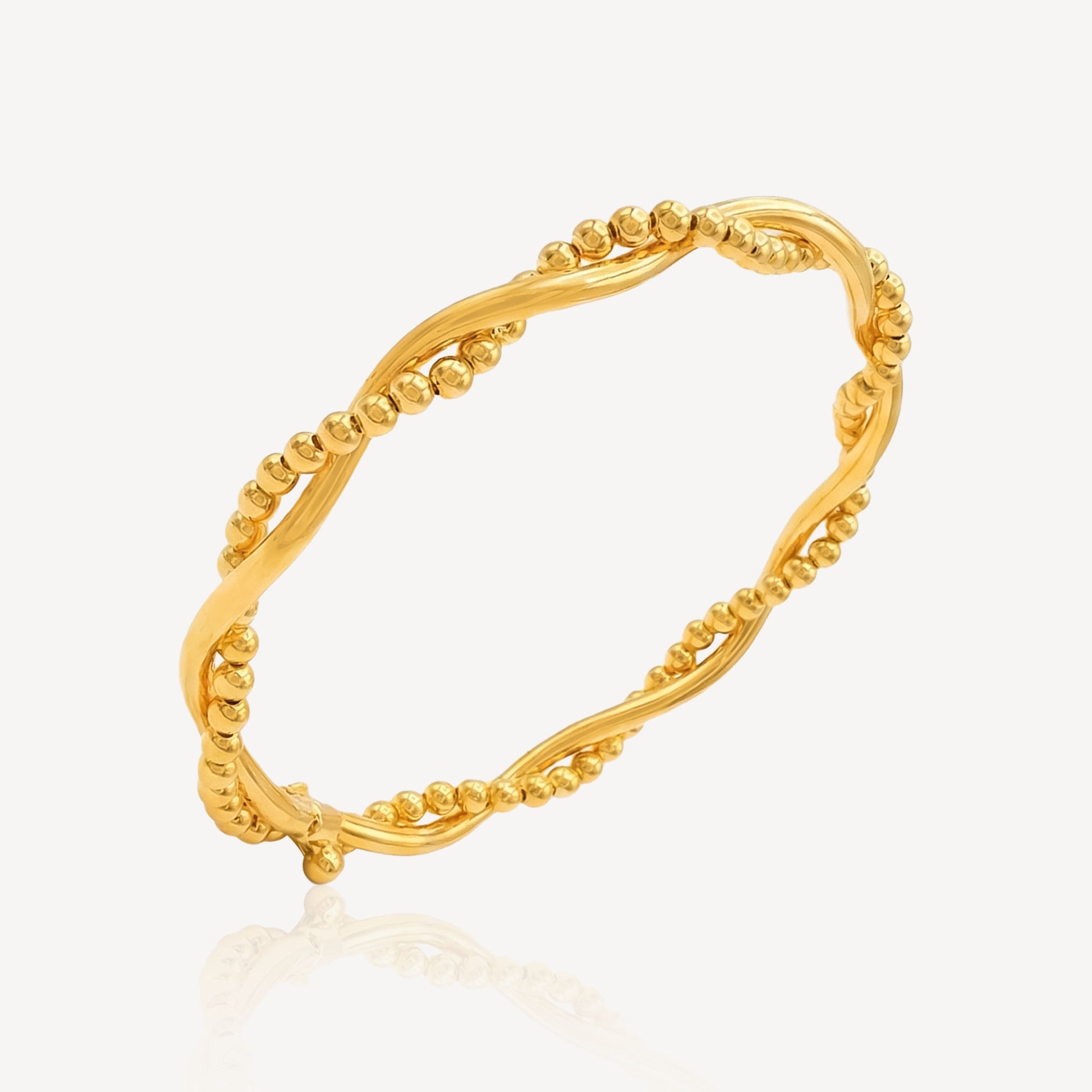 This exquisite 916 gold bangle showcases a sophisticated twist design adorned with delicate beaded detailing. Crafted from 91.6% pure gold, it offers both durability and the lustrous appeal of fine jewellery. The interplay of twisted metalwork and beaded embellishments creates visual depth and elegance, making it a versatile piece suitable for everyday wear or special occasions. The secure bangle closure ensures comfortable and reliable wear. A timeless addition to any gold jewellery collection that combines traditional craftsmanship with refined aesthetics.