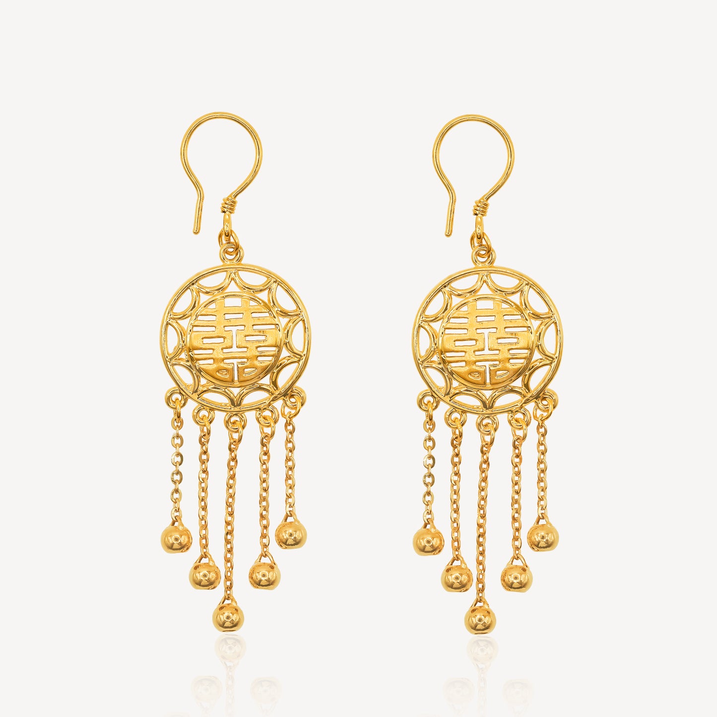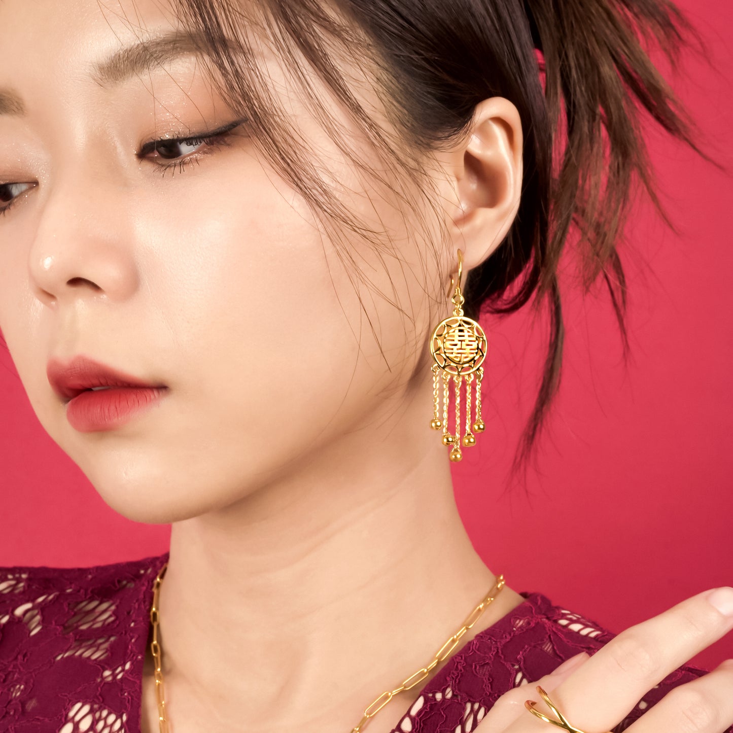 这款优雅的婚礼囍耳环采用优质999黄金打造,是您大喜之日的完美配饰。精致的囍字图案象征着双喜临门和好运连连,是任何婚礼造型的点睛之笔。佩戴这款令人惊艳的耳环,展现您的时尚品味,传递您的祝福。