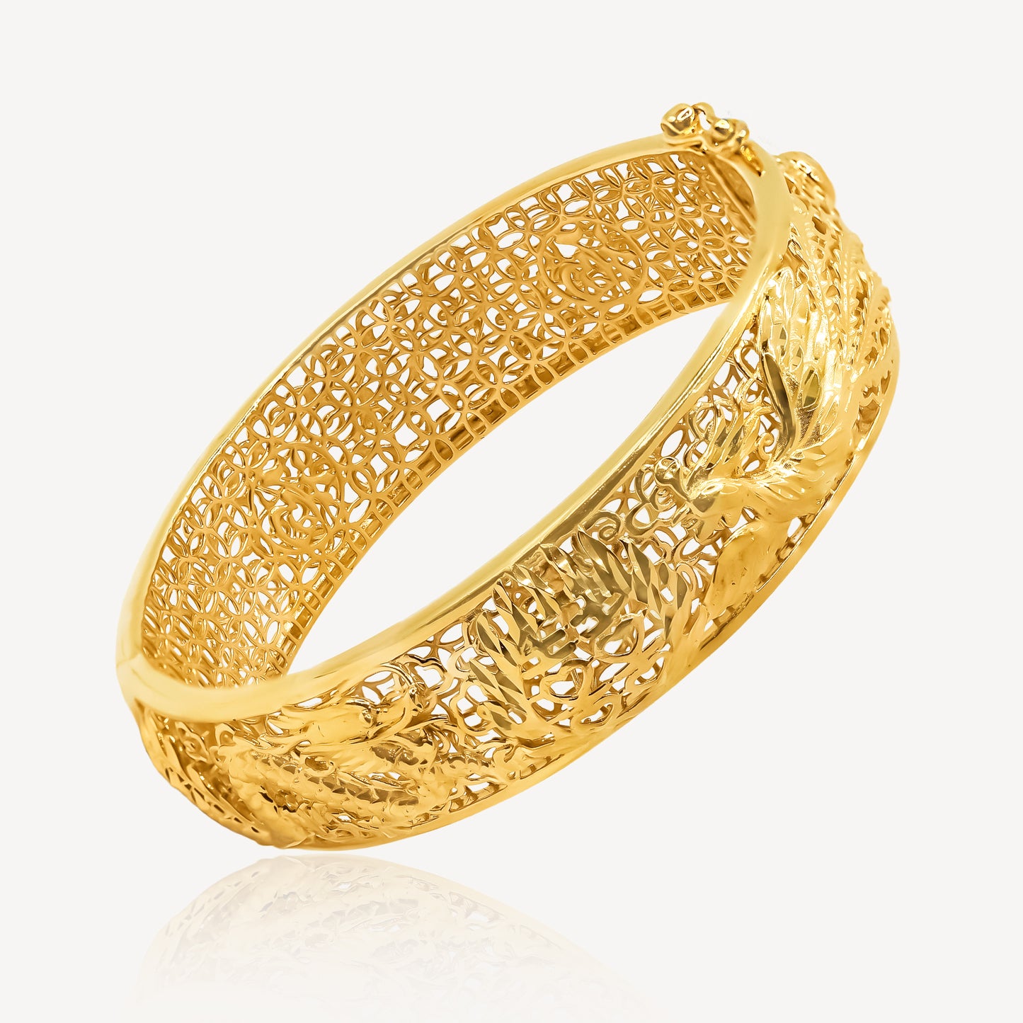 这款916金龙凤婚戒采用91.6%纯金打造,细节精致。设计中以象征吉祥如意和婚姻美满的龙凤图案为特色。这款手镯是任何婚礼的完美之选,是任何珠宝系列中永恒优雅的点睛之笔。