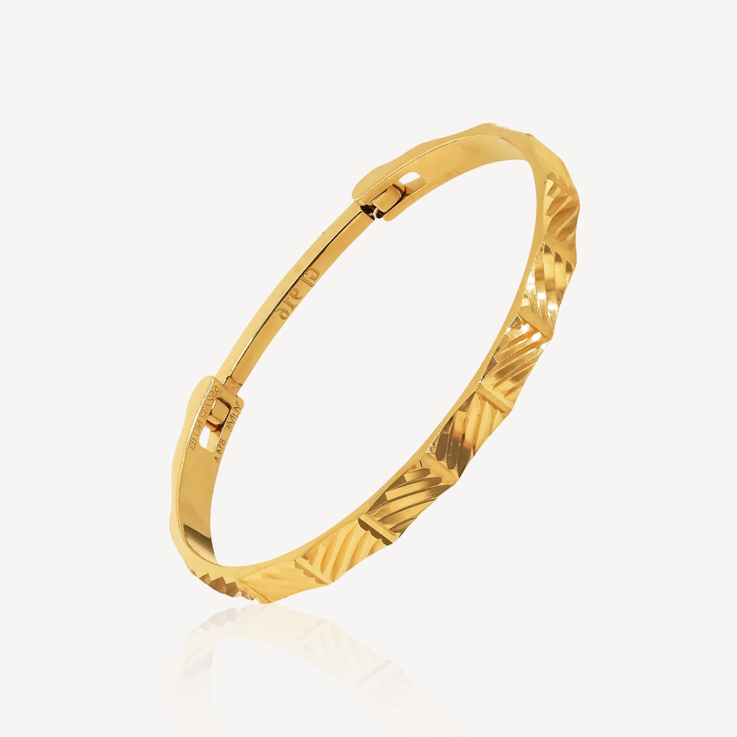 这款优雅的手镯采用优质916玫瑰金打造,饰有时尚现代的条纹设计。它能为任何造型增添一抹精致,提升您的个人风格。